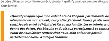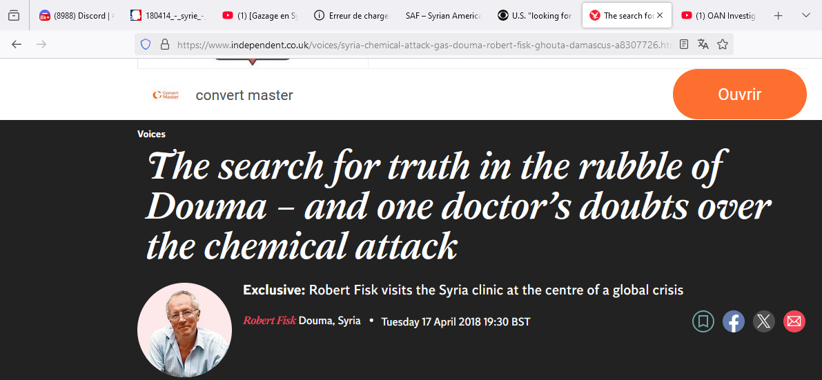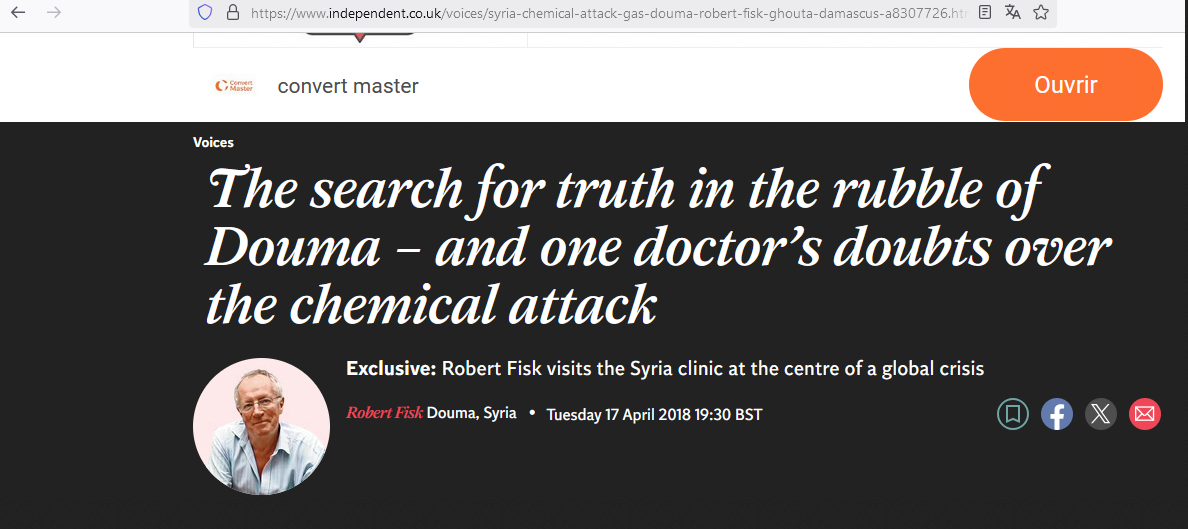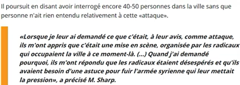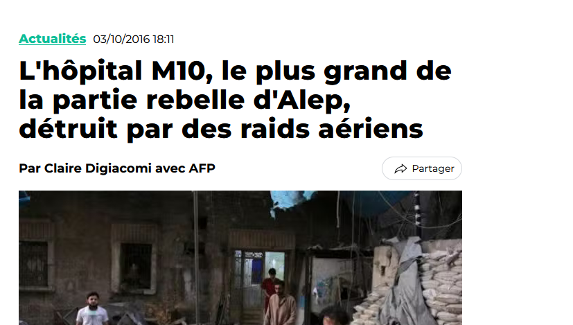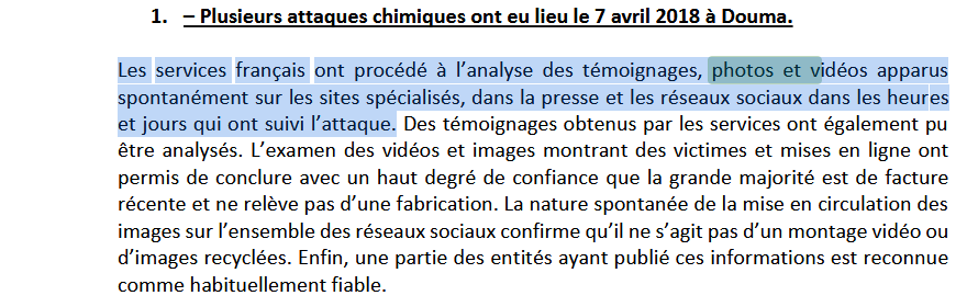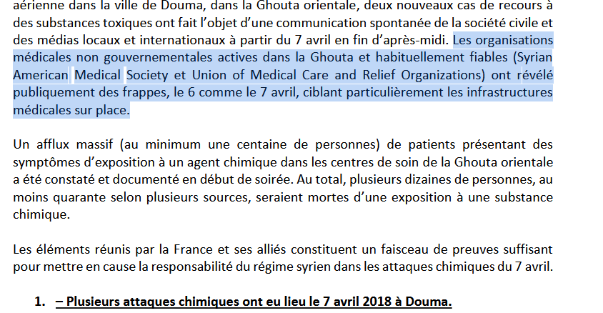 D'ailleurs c'est quoi les preuves en question? Juste des images et des vidéos diffusés sur les réseaux sociaux. Quand je pense que les médias en ont fait des tonnes sur les fake news des réseaux sociaux et que le gouvernement français sous Macron n'a eu de cesse de vouloir contrôler les réseaux sociaux voire les envisager à les couper plus récemment. Tout ça pour qu'en 2018, sur la base de quelques photos et vidéos postés sur les réseaux, ils soient allés bombardés la Syrie. D'autant plus qu'on savait qu'il était largement possible à ce que l'attaque chimique était une déformation de la réalité complétée par une mise en scène. Un garçon de Douma avait révélé les détails quant au tournage de la vidéo sur l'attaque chimique. Lui et sa famille décrivaient un tournage organisé par les Casques blancs. Cette version des faits a été confirmé par un reporter britannique travaillant pour The Independent ainsi qu'un journaliste américain présent sur place. Ces derniers relayent les témoignages d'habitants disant qu'il n'y a pas eu d'attaque et que la vidéo est une mise en scène des islamistes. Ces mêmes islamistes qui étaient désespérés et avaient besoin de fuir l'armée syrienne qui leur mettait la pression. Dans l'évaluation nationale, les services français ont estimé qu'une manipulation des images diffusée à partir du 7 avril n'étaient pas crédibles, dans la mesure où les groupes présents dans le Ghouta n'ont pas les moyens de mener une maneuvre de communication de telle ampleur. On rappelle que ces groupes sont financés par des ONG bidons qui reçoivent eux même des dizaines et des dizaines de millions par an justement pour produire de la communication. Les Casques blancs ont déjà plusieurs fois été accusés de mise en scène. Avec 3 messages twitter et 1 communiqué, la SAMS a fait dire à tous les médias français que l'hôpital M 10 à Alep avait été totalement détruit.