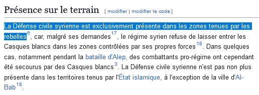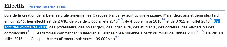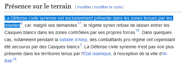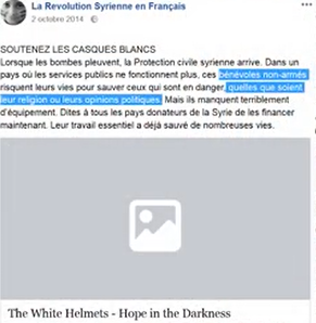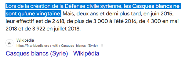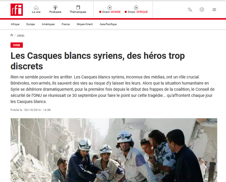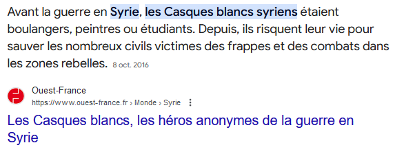 L'autre organisation beaucoup cité dans la presse comme étant une ONG fiable était la Défense civile syrienne, patronyme usurpée par une organisation plus connue sous le nom de Casques blancs. Elle se présente comme une organisation indépendante financée par aucun gouvernement et ne prenant pas part dans ce conflit. Soit disant ce sont des gentils civils syrien mettant leur vie en danger chaque jour pour sauver tout le monde sans distinction. Un classique là aussi. La réalité est moins belle. Pour commencer, c'est une organisation créée en 2013 James Le Mesurier, ancien militaire britannique reconverti en mercenaire puis dans l'humanitaire. Cette association est financée par les Etats Unis, la France, l'Allemagne, le Japon, les Pays et bien sûr le Royaume Uni. Le budget total est de plus de 100 millions de dollars. Comme par hasard présente que dans les zones contrôlés par les rebelles, donc les islamistes radicaux. La SAMS, les Casques blancs et l'UOSSM et autres sont des ONG tout sauf indépendantes, des ONG de façade, financés par l'Occident, travaillant avec les islamistes pour 4 missions principales. A savoir fournir du matériel de l'extérieur sous couvert d'humanitaire, organiser l'assistance médicale des troupes sur le terrain, servir d'interlocuteur avec nos gouvernements et bien évidemment pour que les médias de propagande produisent leur papiers bidon pour que les populations occidentales prennent parti pour les rebelles syriens. Par exemple durant la reconquête d'Alep par l'armée régulière syrienne, les médias occidentaux se sont émus de la destruction du plus grand hôpital d'Alep est par les bombardements du régime d'Assad. Notamment l'article de l'obs du 3 octobre 2016 se basant avant tout sur les affirmations d'une seule ONG.