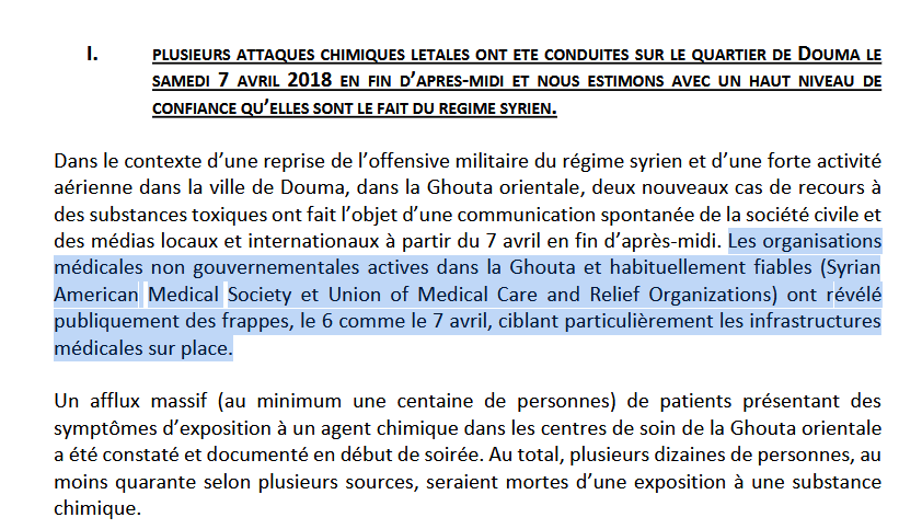 Sous couvert d'être une association humanitaire et neutre, la SAMS passait son temps à dénoncer des soit disante exactions du régime de Bachar en particulier concernant les attaques chimiques. Comme par hasard, cette association n'était présente que parmi les zones dites rebelles, donc contrôlés par les islamistes radicaux, qui sont eux aussi financés par les pays de l'OTAN ainsi que le Qatar et l'Arabie Saoudite, dans le cadre d'une guerre pour le gaz et le pétrole qui a dégénéré en conflit religieux. Pas étonnant que les médias occidentaux aient relayé l'information de manière peu objective tout en présentant l'information comme étant neutre alors que ce n'était clairement pas le cas. Le plupart des informations étaient fournies par cet ONG qui était tout sauf neutre. L'UOSSM pour ce qui est de l'autre OGN cité par le rapport français, c'est la même chose mais en plus flou. Il s'agit d'une fédérations d'ONG médicales implantées dans les pays de l'OTAN mais aussi inconnue du grand public. La mission officielle qu'elle s'est donné était de soigner le maximum de gens possibles et tous les syriens victimes de la guerre sans distinction. La traduction exacte serait, soigner les rebelles. On ne sait pas qui les finance. Et de la même manière, on ne sait pas exactement qui les dirige. Difficile de trouver des informations sur la page français. On les connait avant tout grâce à leur site internet où on trouve juste quelques belles phrases par ci par là avec de bonnes intentions visiblement, à première vue. Avec quelques photos qu'on croirait sorties de Stock image.