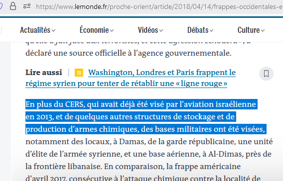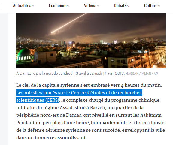 On doit parler des fameuses frappes occidentales ayant ciblé le CERS, un centre de recherches et d'études scientifiques. Ca a été transformé par la presse en un complexe chargé du programme chimique militaire d'Assad. Déjà il n'y a aucune logique à faire péter un arsenal chimique situé tout proche des civils pour éviter qu'Assad ne les fasse péter loin des civils. De plus, ils avaient prévenu quant aux cibles qu'il allaient bombardés histoire de ne pas toucher les soldats russes avec les risques que cela entraînerait diplomatiquement et militairement. Cela veut dire que Bachar a eu plusieurs jours pour déplacer l'arsenal chimique avant l'intervention qui a du perdre de son efficacité potentielle sans l'effet de surprise. Dans le même temps, la France vendait des armes à l'Arabie Saoudite malgré le carnage effectué au Yémen. Et à cela s'ajoute les multiples crimes de guerre d'Israel commis sur les civils palestiniens sur lesquels nos politiciens sont restés silencieux. Tout objectif moralisateur est discrédité par de deux poids deux mesures. Macron a prétendu que bombardé l'armée syrienne, ce n'est pas déclarer la guerre à Bachar Al Assad. Macron a utilisé l'excuse du viol du droit international alors que j'ai démontré plus haut qu'il était le premier à le violer en plus de violer sa propre constitution à des dizaines de reprises. Des gens qui s'installent dans un pays étranger, qui ne respectent pas le droit international, qui s'en prennent aux civils délibérément et qui veulent changer de régime de manière forcé, contre la volonté du peuple concerné, cela rappelle la coalition internationale, les zadistes. Il faut également parler des actions de l'ONU et de l'OIAC. Cela en dit très long sur l'hypocrisie des frappes occidentales.