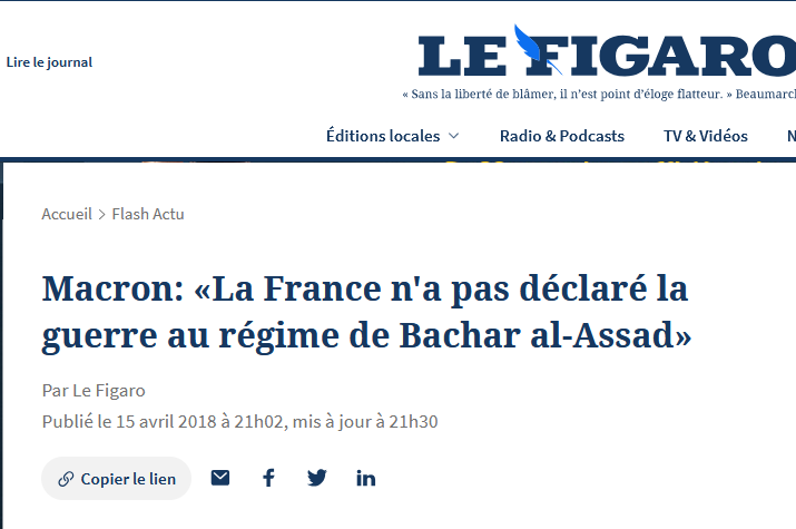 Pour ce qui est des armes chimiques en elles même, il faut savoir que Bachar a développé, fabriqué et entretenu des armes. Avec la guerre civile. Avec la présence de son armée, puis de ses ennemis, il n'est pas impossible qu'il ait tenté d'organiser une rencontre avant l'aide des Russes. Ce serait ridicule de s'en servir à ce moment là en 2018 où ces armes ne faisaient plus de différences sur le terrain. En avril 2018, tout le monde savait que l'Armée syrienne avec l'aide de la Russie avaient gagné cette guerre. 90% des territoires occupés par toutes sortes d'islamistes avaient été reconquis. Il ne restait que quelques poches de résistance vouées à la destruction ou à se rendre, ce qui fut fait par la suite. 3 jours après le soit disante attaque chimique d'Assad, le groupe armé de Douma s'est rendu. Diplomatiquement comme militairement à ce moment là, la coalition occidentale ne pesait quasiment rien sur le conflit. Trump avait même annoncé début avril le retrait des troupes américaines de Syrie. La seule manière de revenir dans le conflit était en cas d'utilisation d'armes chimiques par le régime. C'est ce que le figaro avait annoncé, reprenant ce qui avait été dit par Macron. Et comme par hasard quelque temps après, on annonçait une attaque chimique.