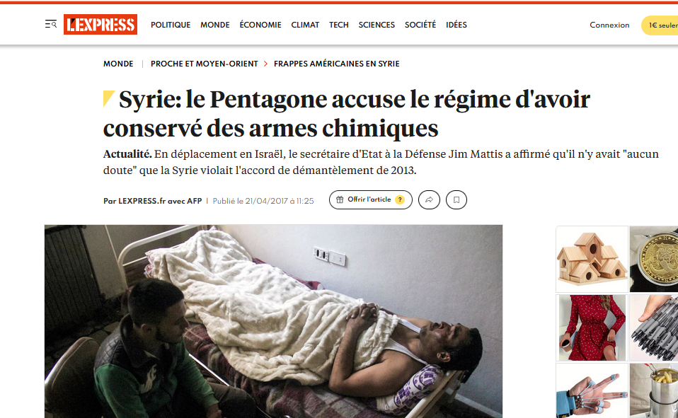 Soit disant il y aurait une attaque commanditée par Bachar Al Assad le 7 avril 2018 à Douma. Il y aurait eu 40 morts. La veille des frappes de la coalition le 12 avril, Macron nous avait assuré qu'il avait toutes les preuves de l'attaque chimique et de l'implication d'Assad. Bizarrement il n'avait pas voulu les montrer là. Il aurait pu transmettre les preuves mais non. Sans doute parce que James Mattis secrétaire à la défense à ce moment là était en train de les chercher. A ce qu'il parait les échantillons fournis par les médecins confirmaient la présence de produits chimiques. Ils ne disent pas quel bord les a utilisé. Finalement la nuit du 13 au 14 avril, la coalition avec les US, la France et le Royaume Uni balance une centaine de missiles sur la Syrie. Et en bon démocrate, Macron a pris la décision tout seul. La population et le parlement, il n'en avait strictement rien à foutre. Sans oublier le viol de la constitution. Sans oublier celui du droit international. Cela en fait une agression illégale. D'autres appellent cela du terrorisme ce qui est factuellement vrai. En bref, il s'agissait de terroriser Bachar pour qu'il ne recommence pas quelque chose qu'il n'avait pas fait et dont on était même pas sûr qu'il l'avait fait. Tant qu'on est soutenu par les néocons, visiblement, on se sent tout de suite investi d'une mission divine permettant de bombarder au nom des droits de l'homme pour un crime qui n'a pas été commis. Au nom des droits de l'homme, de la démocratie, de la liberté ou plutôt des US, d'Israel et de leurs néocons. Il suffit de dire que douter c'est la même chose que nier la Shoah est certains faibles d'esprit se couchent comme des lâches et de soumis. Le 14 avril, après la déclaration de Macron le 13, des preuves nous seront révélés dans une évaluation nationale.