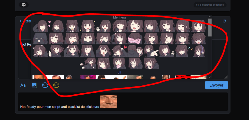 Fonctionnel depuis plusieurs jours même si pas esthétique, ça me sert juste à afficher ultra rapidement tous les stickers que j'aime bien sans à avoir à attendre qu'ils chargent, à les chercher manuellement ou à les ajouter aux favoris.