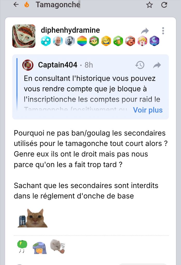 Je le redis, je veux soit le ban pour les deux ou rien, mais la modération prefere ban les nouveaux secondaire et laisser les anciens secondaire (qui sont la que pour le tamagonche)