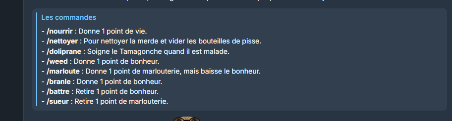 Si la barre de bonheur est vide il faut faire /marloute car c'est la seule commande qui augmente la marlouterie