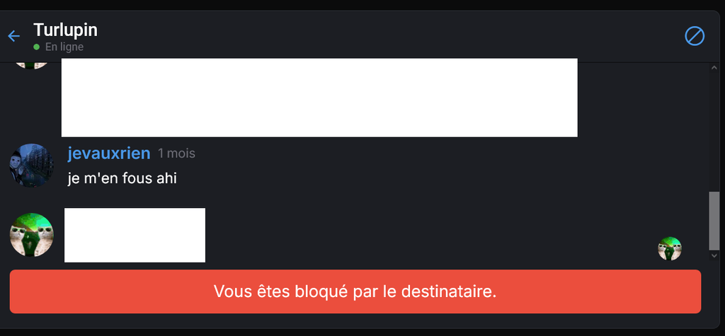 "si je bloque c'est justement pour couper court après des propos ou un comportement cancer mais tu le sais très bien, arrête de faire ta victime par derrière sur des topics, grillé mdr "