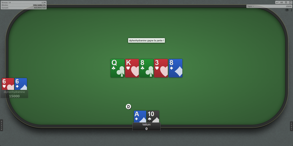 3 ème : WaifuGhislaine concassé par Valium avec Paire de Neuf Hauteur Sept contre Paire de Huit Hauteur Roi lors de la manche n°43