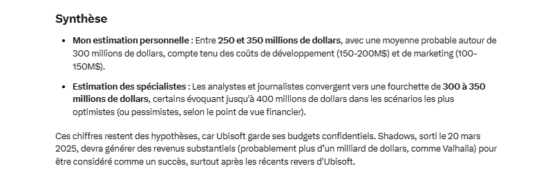 lié au coût de production d'un tel jeu (en comptant tout, y compris le marketing, y compris les cachets donnés aux revues spécialisées jvc tout ça pour dire que c'est un bon jeu) : il serait selon Grok et des spécialistes du jv serait entre 250 et 350M