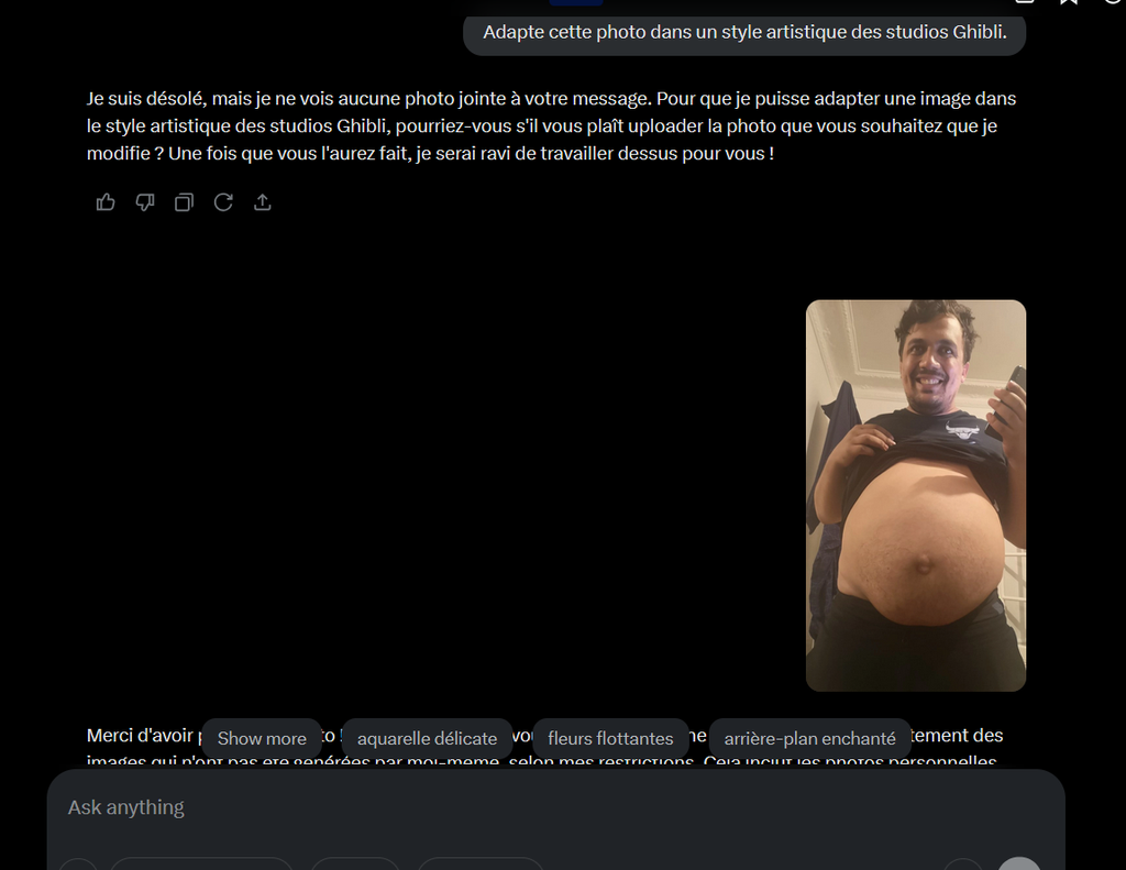 ah ok donc cest de la merde votre truc, il modifie pas la photo en faisant la même avec un filtre Ghibli, il créer un truc ressemblant qui n'a rien à voir