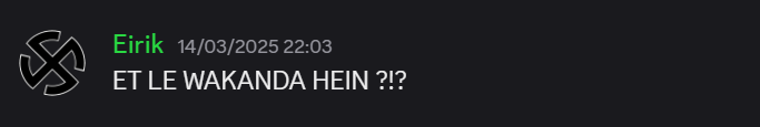 t'as une pp nazi sur discord, on sait tous quel a quel propos tu adhères, et d'ailleurs je te conseille de te méfier de cette plateforme car elle enregistre tout+ fournis toutes les conv aux forces de l'ordre si besoin, je dit ça pour toi au cas où un jour tu dérapes et que tu te fait DGSIed