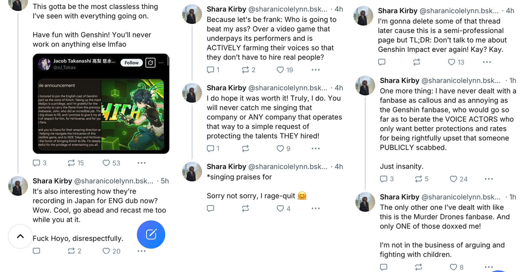 Certains ont juste été forcé dans ce drama. Certaines doubleuses qui sont bien plus engagées que d'autres ont forcé les autres doubleurs à se joindre à eux sous peine de subir un harcèlement. Du coup, Mihoyo est parti engager des Japonais qui parlent à peine anglais pour remplacer les doubleurs américains