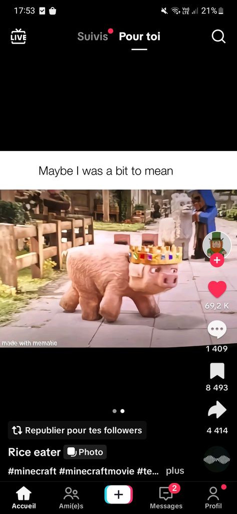 le cochon avec une couronne passe et steve dit que c'est une légende ! C'est un hommage au youtubeur technoblade décédé d'un cancer