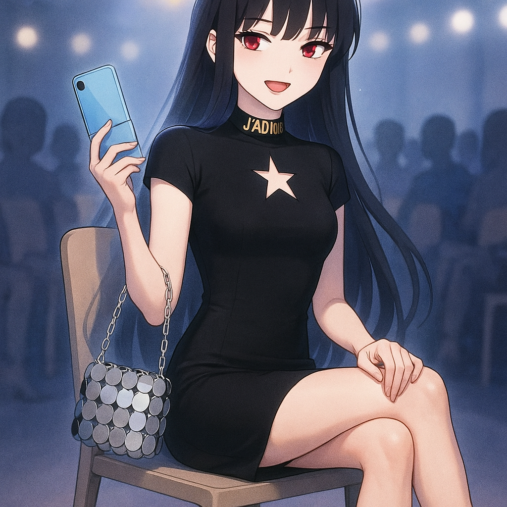 "A stylish young woman attending a fashion show, seated on a simple chair as a spectator. She has a confident, joyful expression. She is wearing a structured short-sleeved black Rabanne dress with a star-shaped cutout at the chest. Accessories include a black ribbon choker with golden “J’ADIOR” lettering, silver sequin Rabanne bag, and glossy black Louboutin platform heels with red soles, clearly visible. She holds a Motorola Razr in pastel blue in one hand. The background suggests the audience at a fashion week runway show. Her overall presence is magnetic and chic, she radiates style without trying."