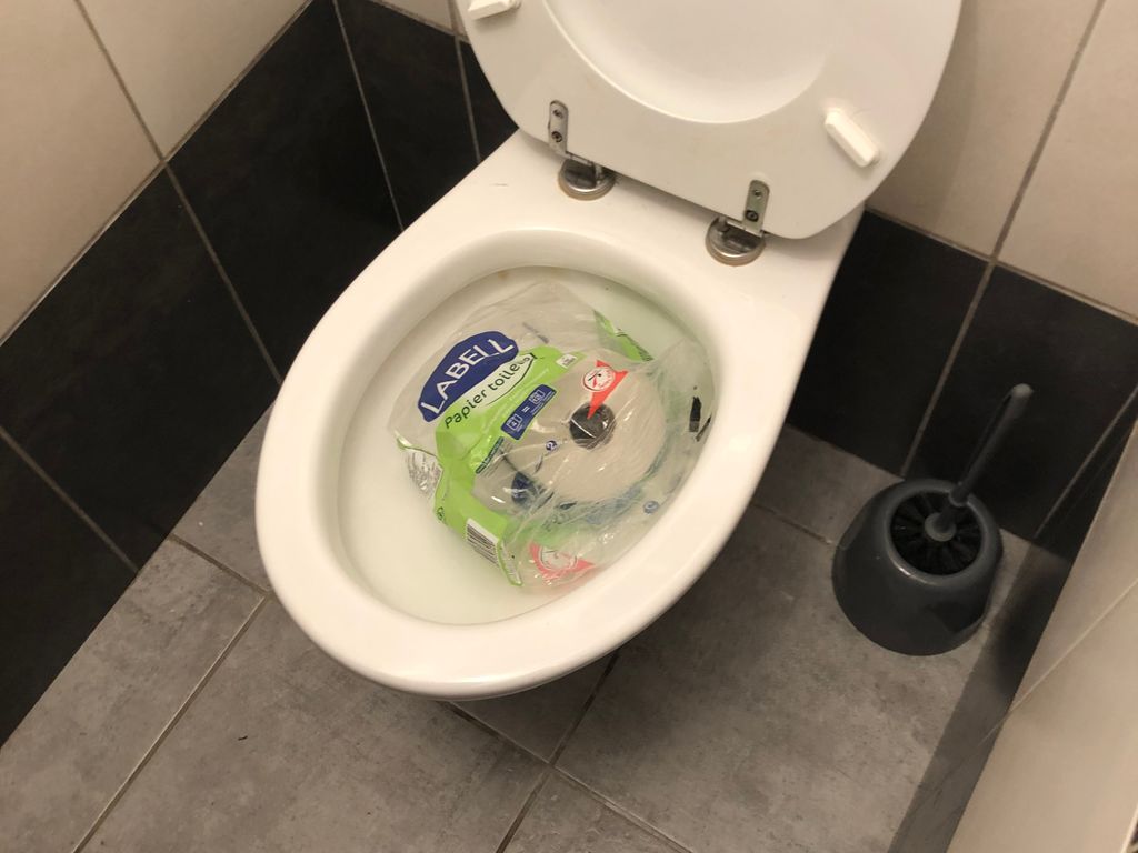 Mais à quel moment tu laisses le papier toilette que tu as accidentellement laissé tomber dans la cuvette dans le chiotte?