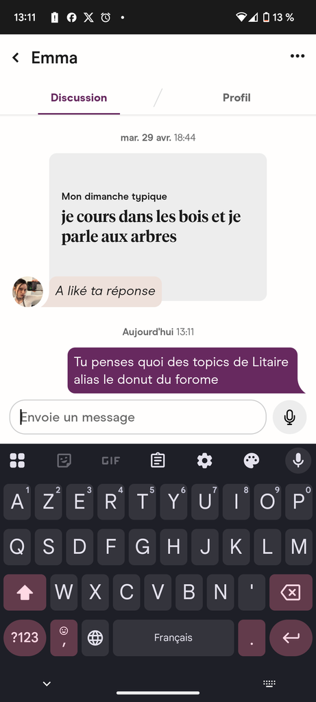 pour ma gouverne Hinge m'empêche d'accepter les likes d'autres filles tant que j'ai pas répondu à assez de messages, du coup je vais purifier mes messages pour pouvoir continuer à matcher