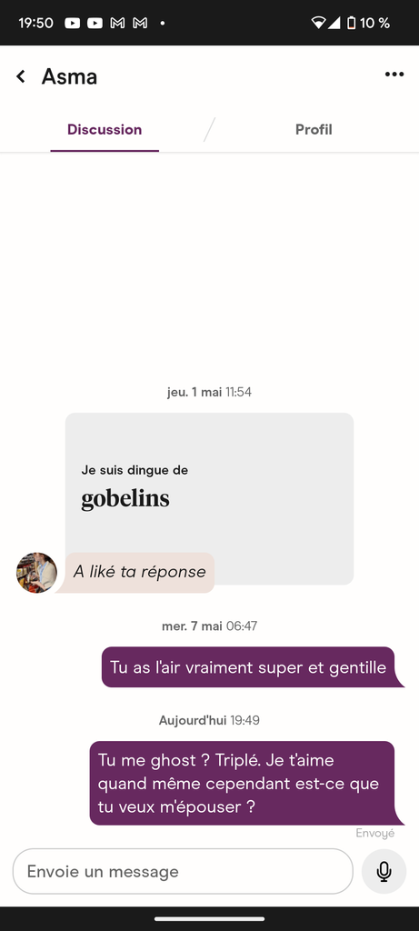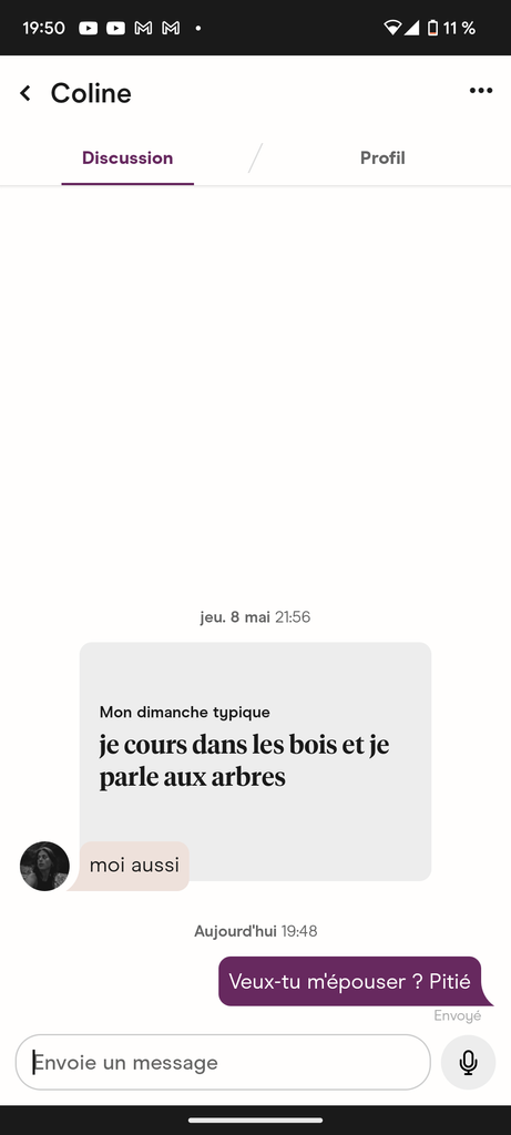 je suis pas certain qu'on puisse envoyer des vocaroos sur Hinge mais si vous avez des phrases funky n'hésitez pas