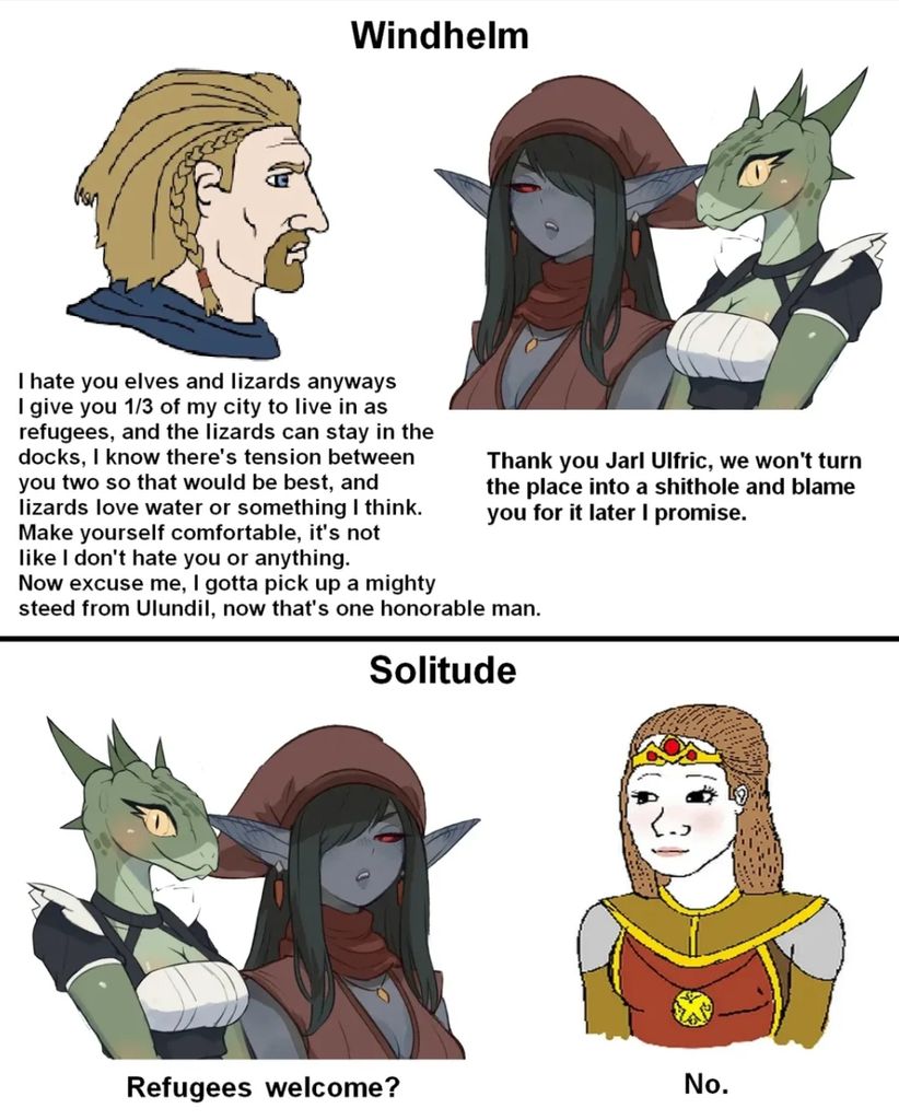 En plus un des mecs a l'ambassade te le dit mot pour mot, dès qu'ils le veulent il en finisse avec les races humaines, ils ont déjà gagnés d'avance et merci Ulfric d'enfoncer encore plus le clou, vraiment un el con ce mec, ouin ouin je veux que ma patrie soit indépendante, super gg grâce a lui l'extinction de sa race et même de l'univers avance a grand pas