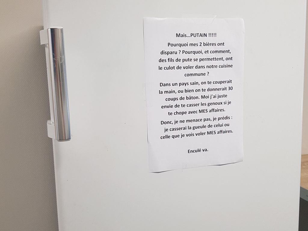 Ça ne sert à rien son message en plus vu que n'importe qui peut rentrer dans notre bâtiment et dans la cuisine commune