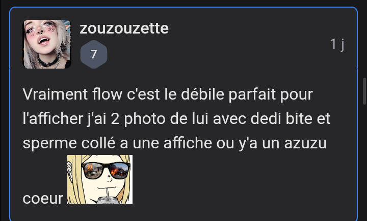 Je l'ai dis la dernière fois ce mec c'est dark jemiscor c'est un autiste méchant il doit sûrement traquer des filles la nuit et tenir des carnets de notes