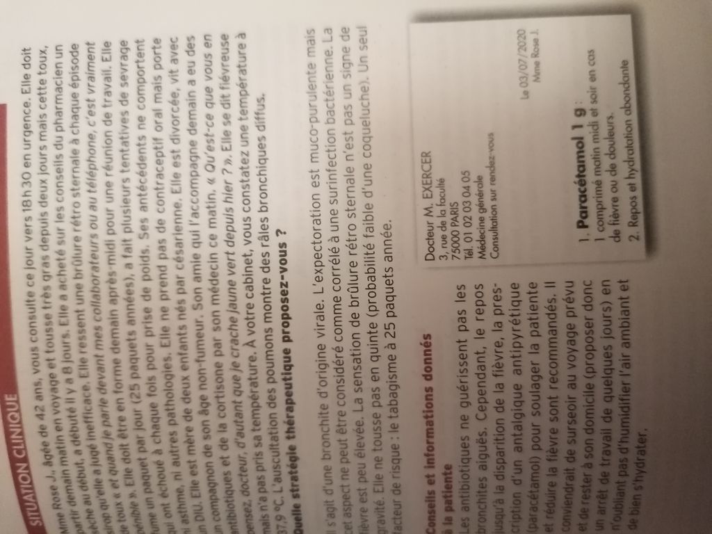Voici ce qui devrait être prescrit dans une bronchite d'après un de mes livres de médecine générale, du paracetamol et conseiller de se reposer et de s'hydrater abondamment autant dire que dans les faits c'est pas souvent ce qui est prescrit