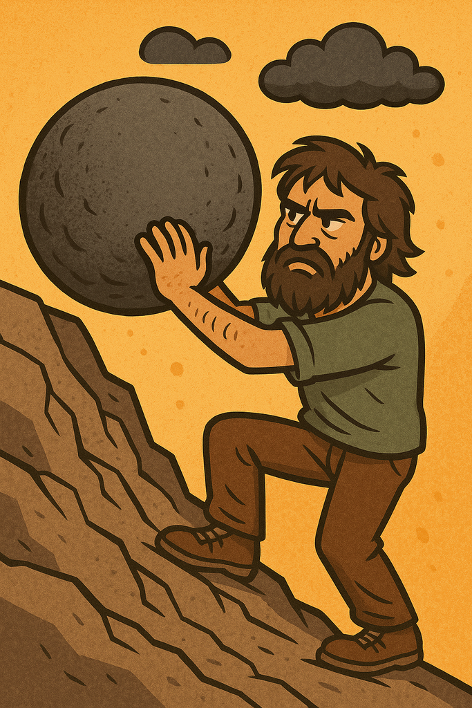 Sisyphe prend visage dans une illustration mêlant introspection et ironie : un personnage calme mais tourmenté, érudit mais critique, dont le vécu et les échanges sur le forum montrent une quête de sens, d’authenticité et d’expression intellectuelle. Il incarne la figure du penseur moderne, à la fois sensible et combatif.