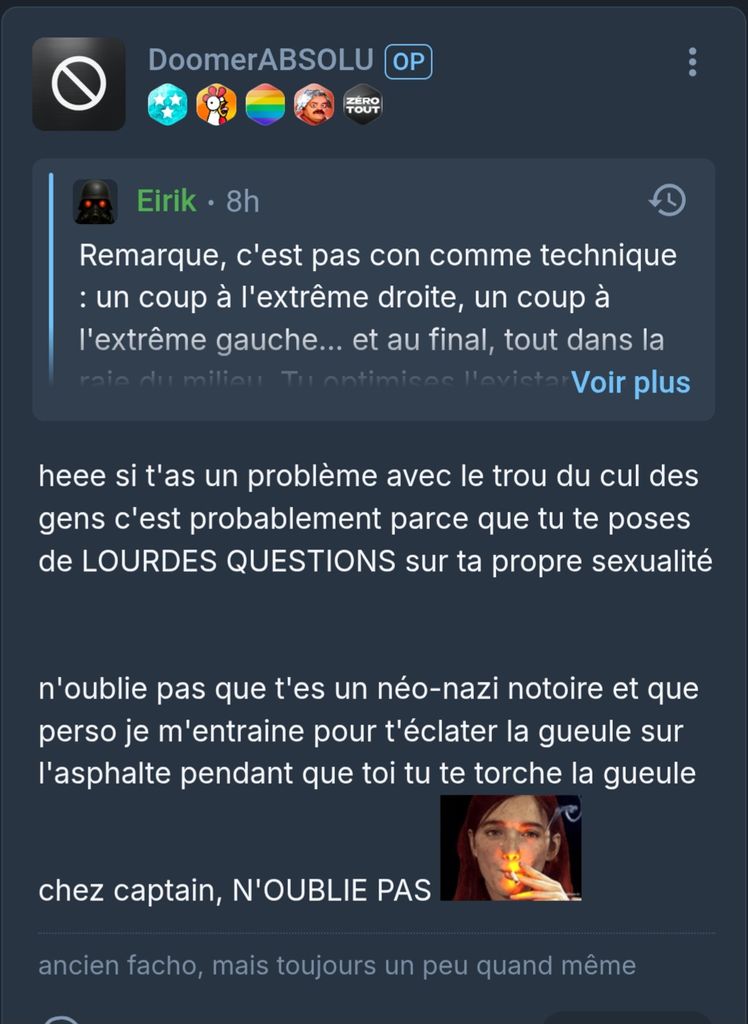 Le dernier qui m'a traité de nazi s'est pris un coup de boule, je le dis franchement
