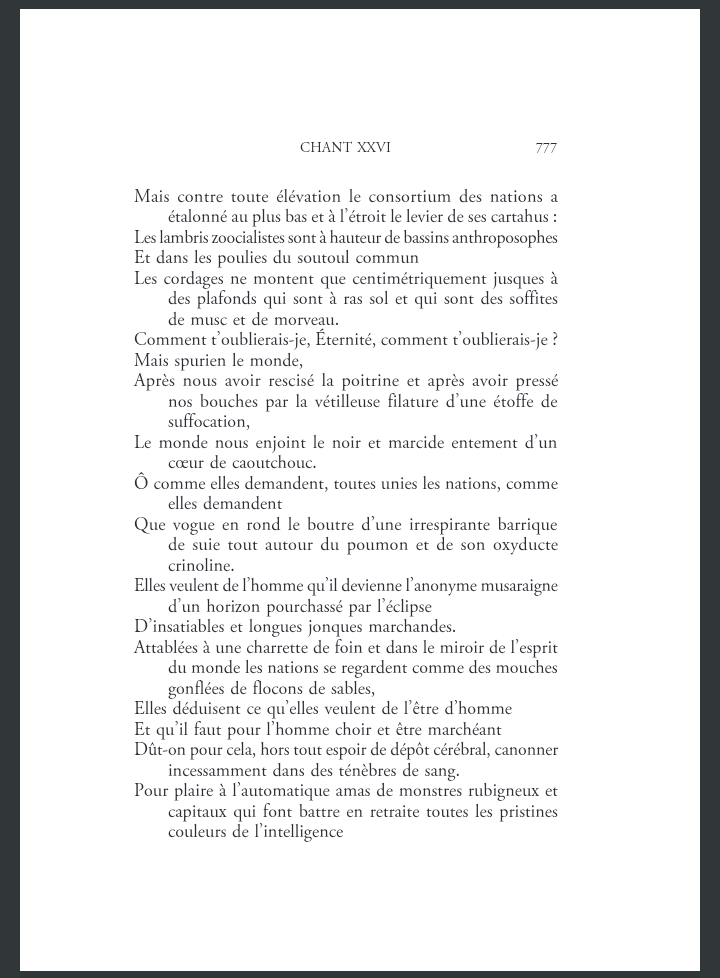 J'ai lu son roman, au début, on le pense très original avec ses archaïsmes, ses jeux de mot et sa musicalité. Puis on se rend compte qu'il ne fait que se répéter, on lit constamment la même page, la même formule, le même propos, c'en devient lassant. Si ses 40 000 vers ne sont que des variations pédantes de ce qu'il peut dire en 400 vers, alors on repassera plus tard pour la "renaissance littéraire". C'est vraiment un poseur pris dans une boucle
