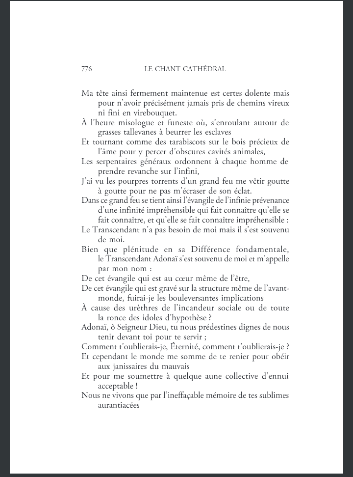 " Le Chant cathédral vit ainsi dans cet excès de grâce que sa parole trouve, ce pourquoi ce grand Poëme qui se fond en un souffle qu’on n’avait plus entendu depuis les origines, est affaire de « trouveurs » "