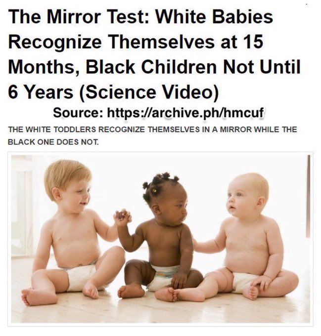 D'ailleurs il y a une étude qui montre que les noirs ne commencent à avoir conscience d'eux même qu'à partir de 6 ans, contrairement aux blancs et asiat' qui développent une conscience d'eux même dès 11 à 12 mois.