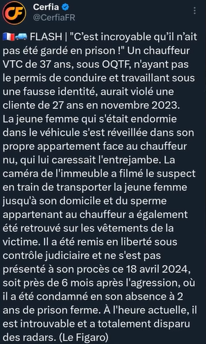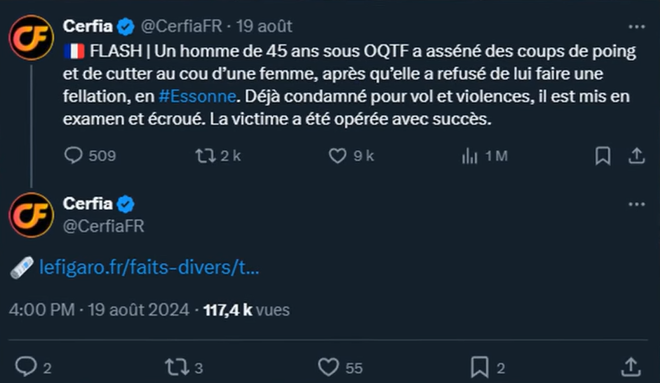 Ici Cerfia parle d'une tentative de viol et de meurtre d'un homme de 45 ans sous OQTF sans rien préciser de son profil en mettant comme source un article du Figaro. A noter que l'article mentionne que le suspect un Marocain, ce que Cerfia se garde de préciser.