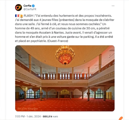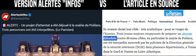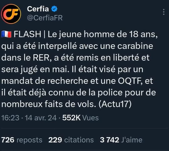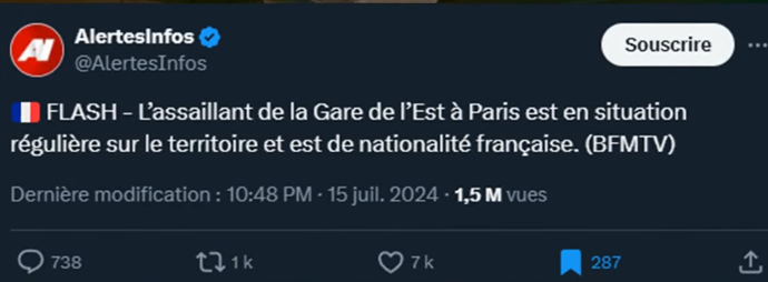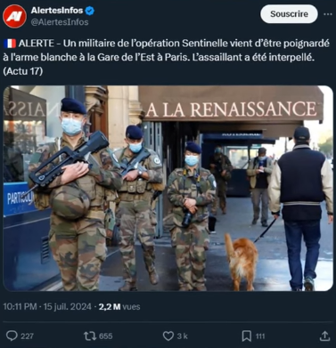 AlertesInfos fait dans le même registre que Cerfia mais en moins subtil. A commencer par leur tweet sur l'attaque à l'arme blanche à la Gare de l'Est.