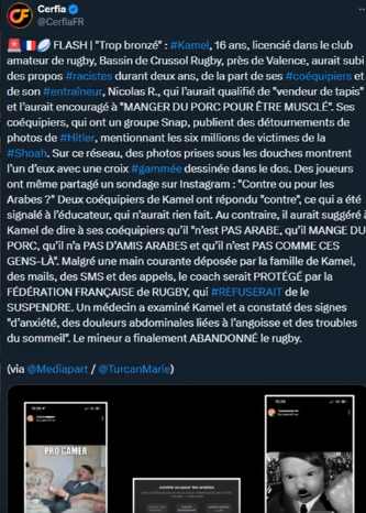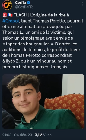 Même chose au sujet de Thomas Perotto, tué à Crépol où Cerfia reprenait le point de vue des accusés comme si c'était vrai, en expliquant que Thomas et ses amis racistes auraient provoqué. Pas un tweet au sujet des témoignages des gens sur place qui ont entendu les agresseurs dire qu'ils étaient là pour planter des blancs.
