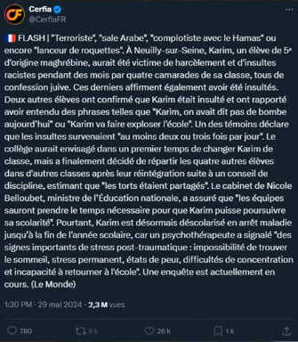 A comparer avec la taille du tweet et le niveau de détails quand un adolescent nommé Karim se fait harcelé par des collégiens. Un gros pavé pour des remarques xénophobes.