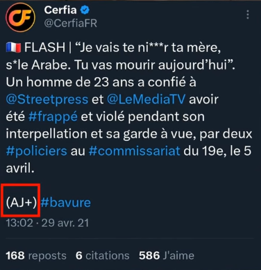 Tout comme Cerfia qui se base sur des officines d'extrême gauche ou sur AJ+ pour balancer des infos à l'arrache sans la moindre preuve.
