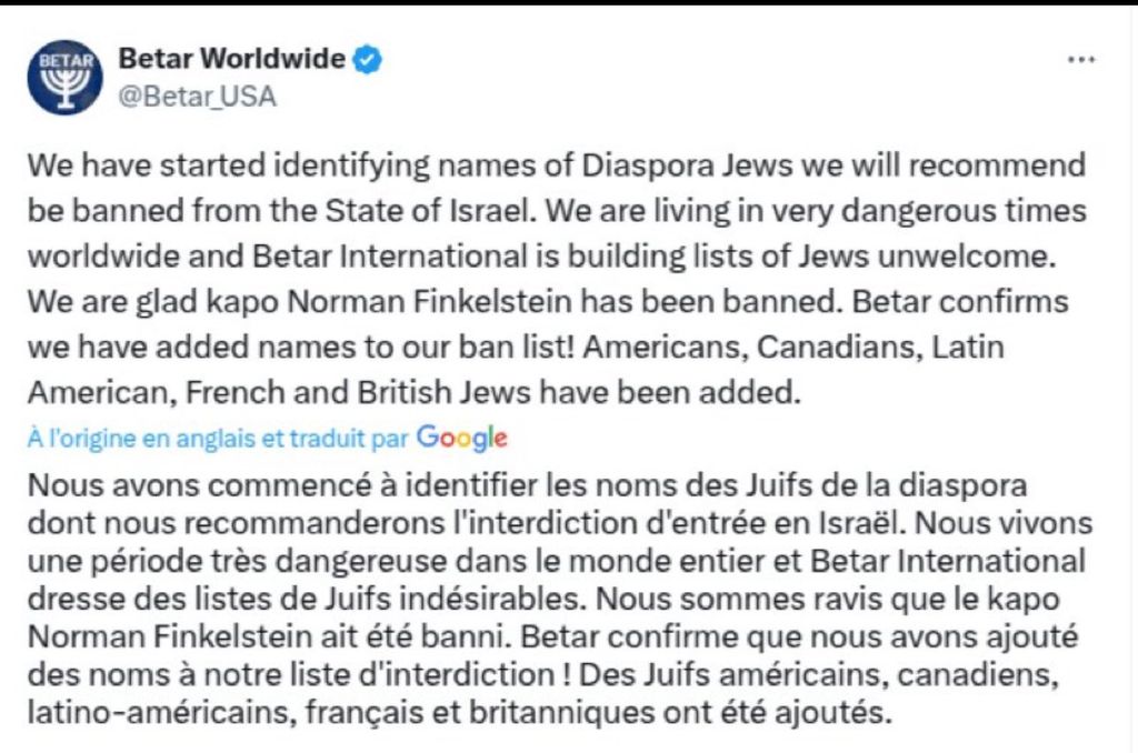 Le tweet surréaliste du Betar à propos des juifs indésirables :