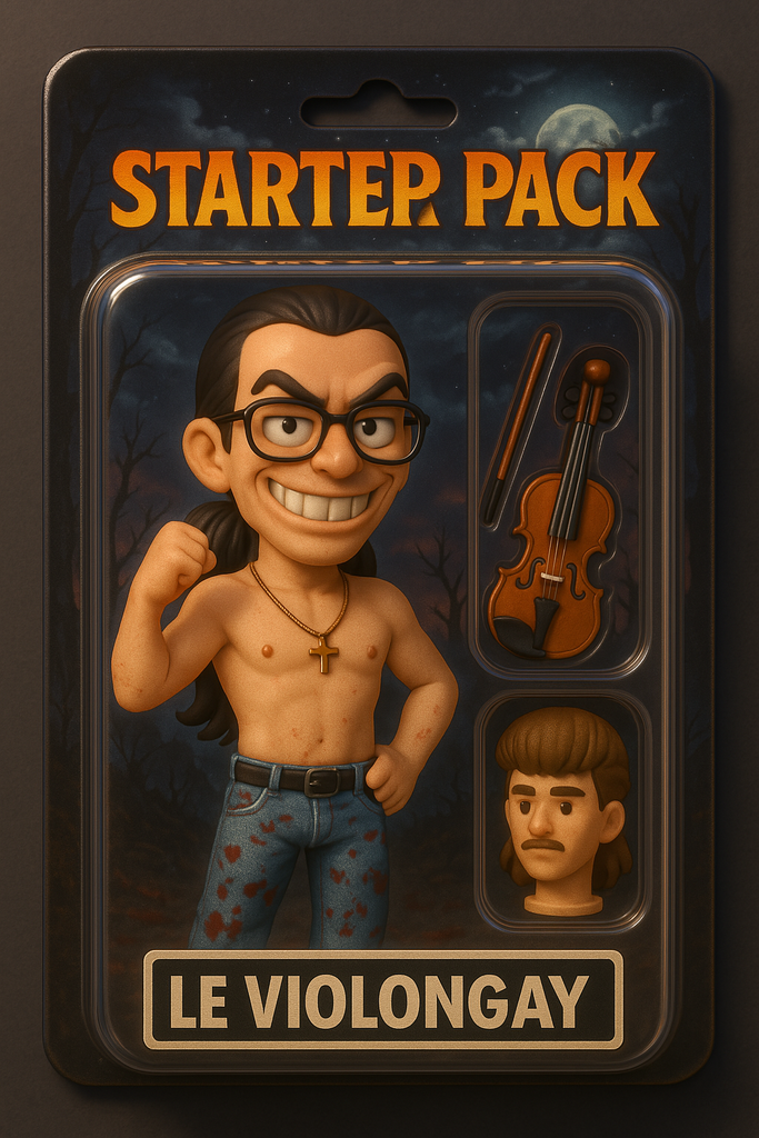 Si j'avais une photo du Freak Violoneux (Son alter ego hétéro d'après ses dires avant qu'il ne supprime ses anciennes chaînes Youtube ainsi que ses sites), j'aurai pu le faire car la seule source qui en avait quelques unes, une page FB nommée " Si toi aussi le violongay te fait peur ! " n'existe plus.