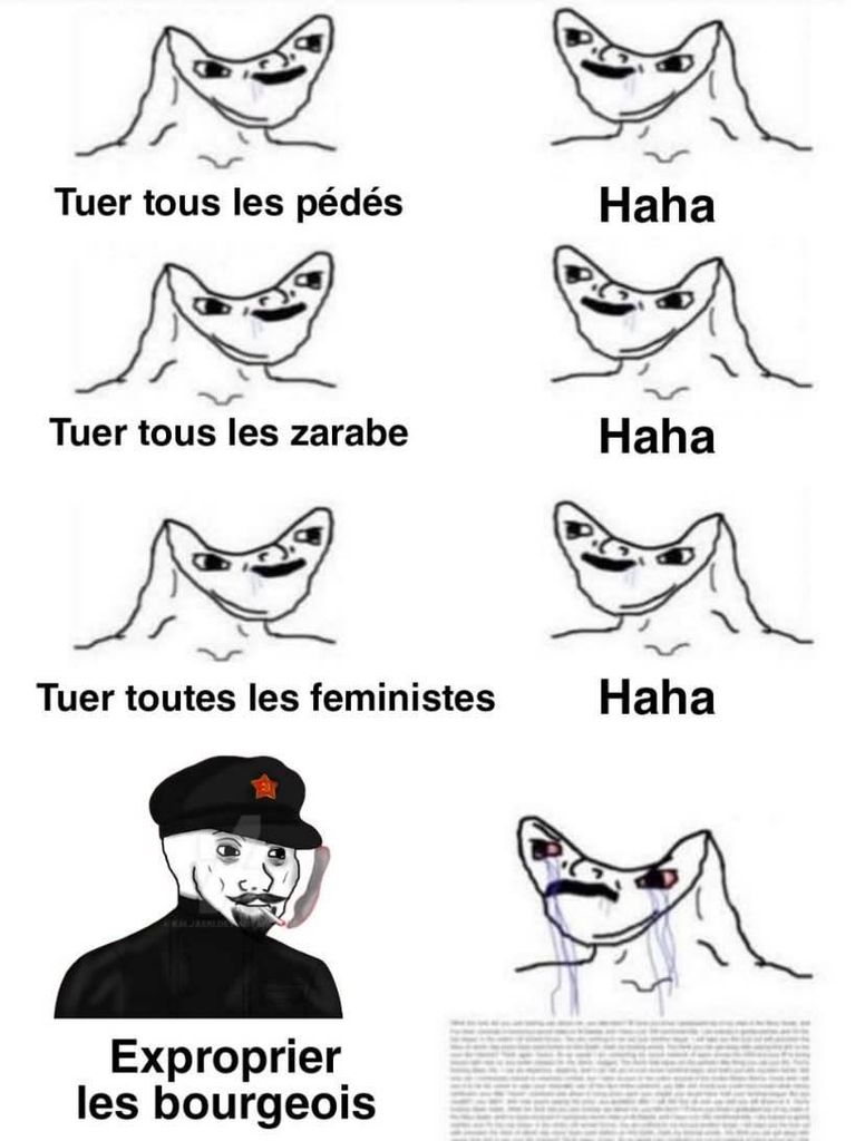 celui que tu viens de poster par exemple, j'ai du mal a le superposer à la réalité car la réalité c'est que c'est souvent les prolos qui vont voté RN, du coup le fait qu'on exproprirais les bourgeois ca ne les toucherais pas plus que ça.