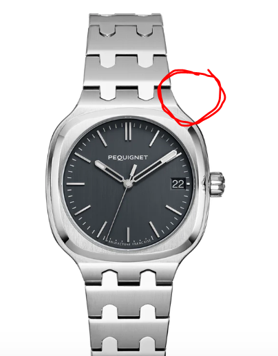 la ou j'ai entouré je trouve que la courbe est trop "appalatie" dans le sens ou la forme du boitier se veut plus carrée alors que le cadran est rond, ce qui accentue encore plus le rayon de raccordement entre le boitier et le bracelet.