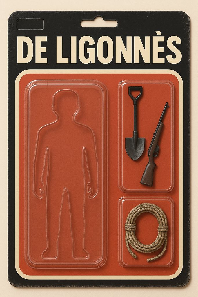 Le personnage se tient debout, moulé dans une boîte en plastique transparente fixée sur un support en carton plat. Il doit ressembler à la photo que je joins. Le ton général est léger et réaliste.