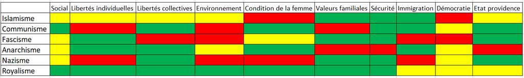 J'ai mis en jaune pour la liberté individuelles des islamistes pour le simple fait que ça dépend de quel pays on parle en vrai. L'entreprenariat et l'ascension sociale font parti des libertés individuelle par exemple, et c'est pas quelque chose de condamné dans l'islam. Mais oui là je t'accorde que sur ce point j'aurais pu mettre ça en rouge.