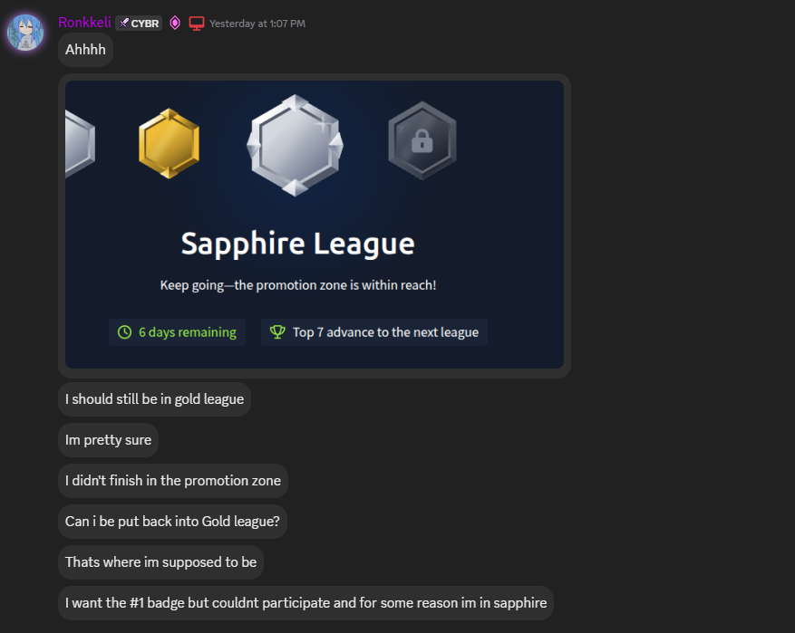 C'est super bizarre effectivement que tu es skip une league d'un coup, et ton truc de la dernière league aussi où tu as eu le badge alors que tu étais passé deuxième