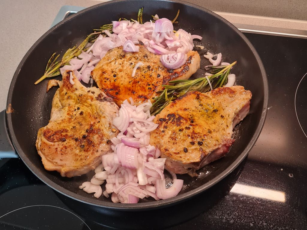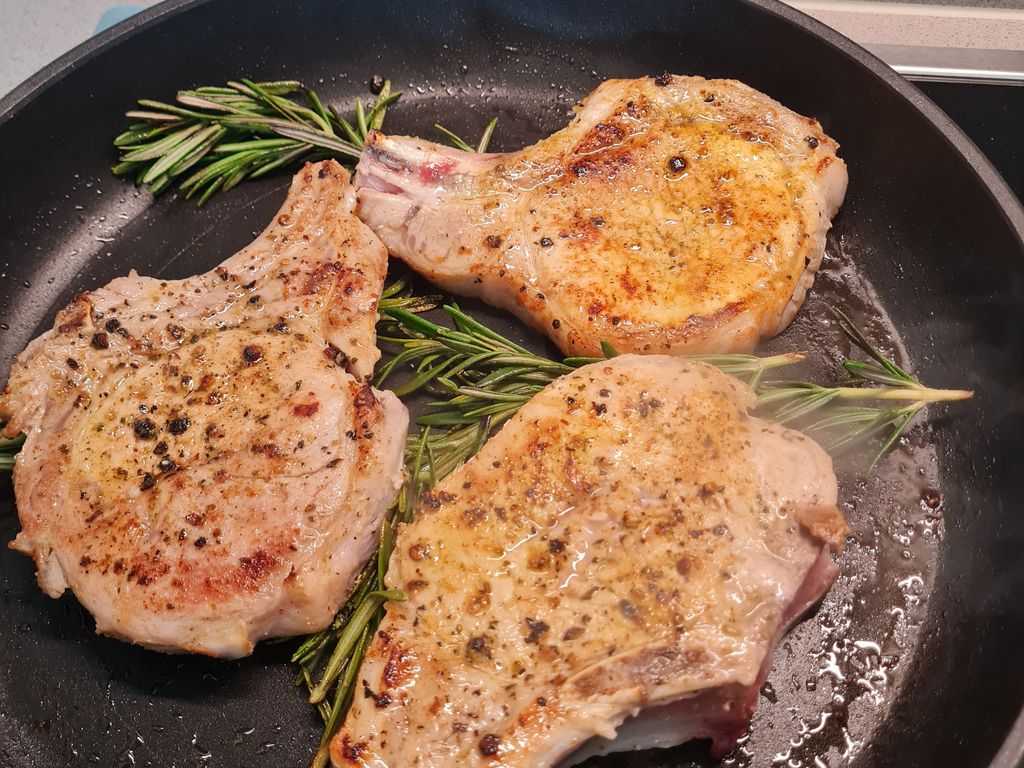 Je fais cuire légèrement la côtelette sur le flanc où c'est gras pour huiler la poêle.