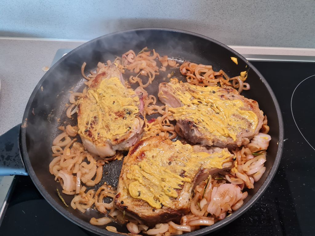 Oui j ai sortie la viande peu après avoir mis les échalotes à revenir je voulais pas qu elle soie trop cuite mais j aime bien déglacer avec la viande badigeonner de moutard
