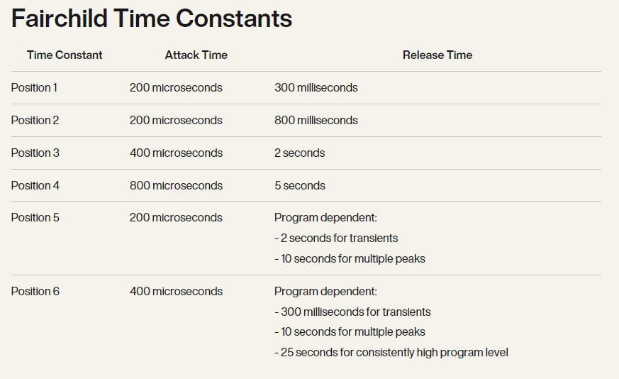 Il est plutôt lent et très bien sur les pistes vocales, les guitares, basses, sa lenteur permet de garder le punch avant de réduire le volume.