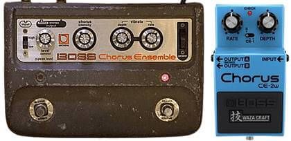 Le Boss CE-1 est un chorus à 2 voix. Cela signifie qu'il dispose d'un signal dry combiné à un signal qui est retardé et modulé. La modulation du signal retardé entraîne une oscillation de la hauteur du signal, ce qui produit ce son caractéristique qu'on appelle chorus.
