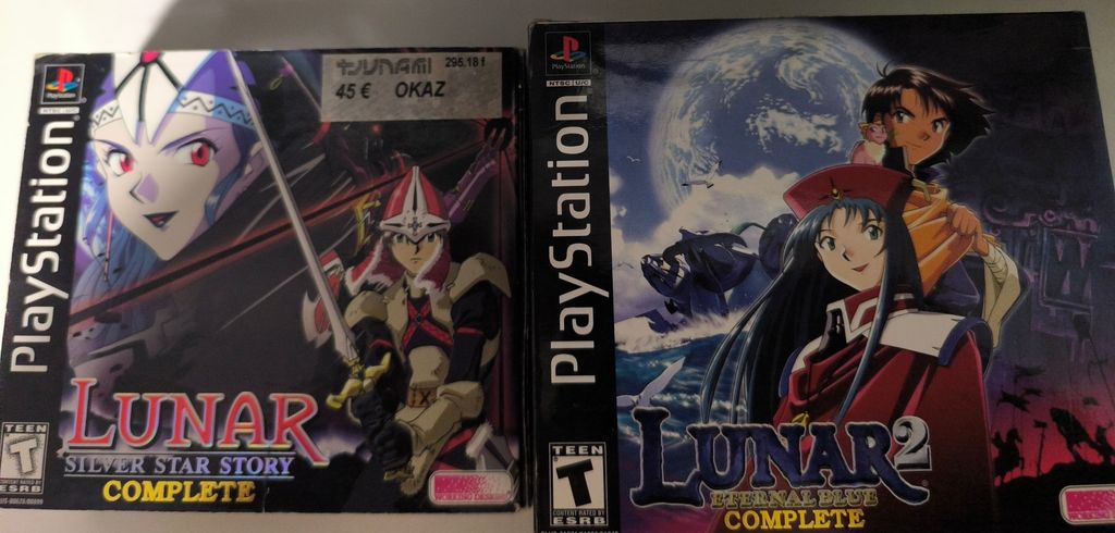 Lunar 1 et 2 en version collector complète toujours en bon état, tous les 2 sont d'excellents RPG avec de belles cinématiques, j'avais passé quelques semaines dessus et j'attendais que la fin du taf pour continuer