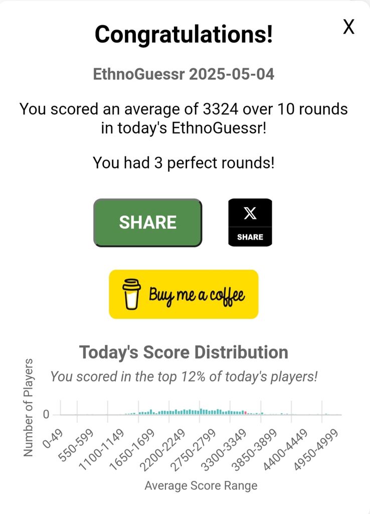 You scored an average of 2032 over 10 rounds in today's EthnoGuessr!