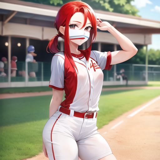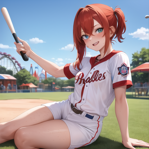 Thin little Redhead with freckles in a baseball outfit in a Theme park