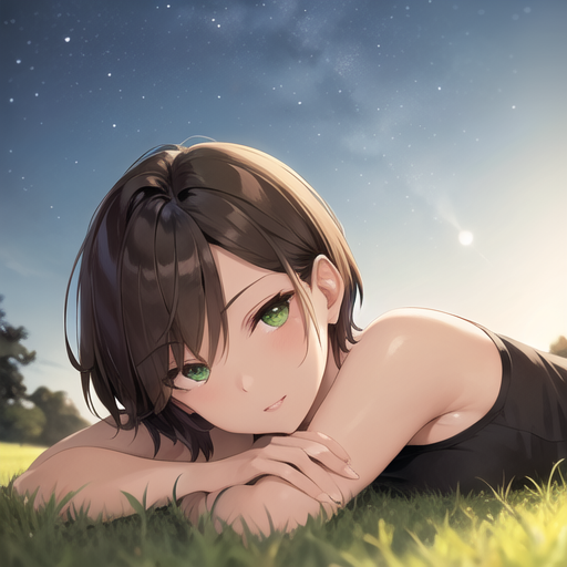 Short haired brunette with green eyes lying on the grass looking at the night sky