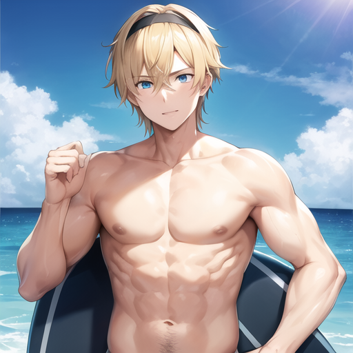 Tu peux essayer "blond-hair pecs surfer black-headband blue-eyes"